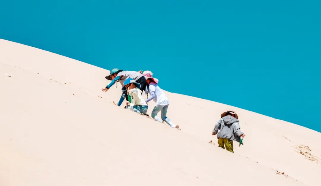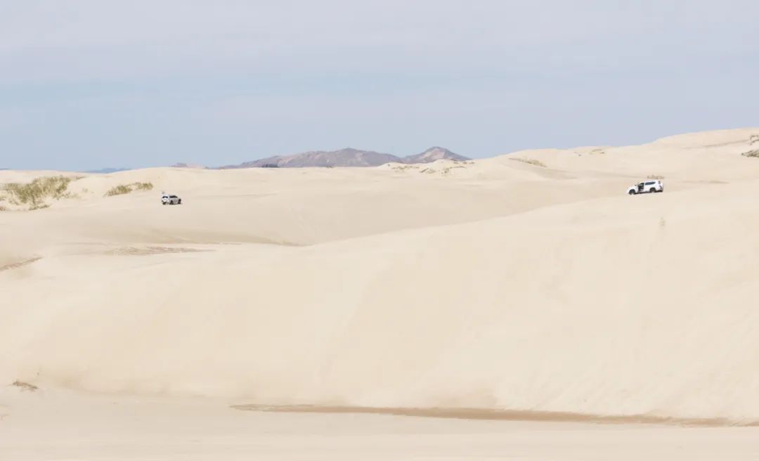 轮胎沿着沙坡迂回环绕,车侧身与地面呈 270 度,一时仿佛脱离了地心引力的限制,沙粒在车窗外喧嚣,来不及反应,越野车已立于沙丘之上。