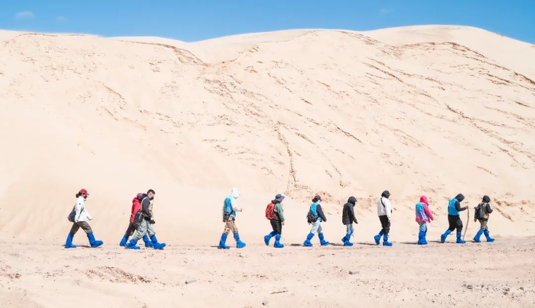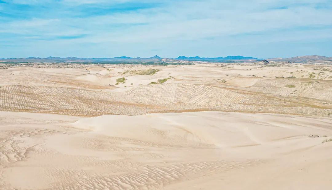 徒步中我们也可看见当地人民治沙的努力:麦草方格治沙,将麦草插入流动沙丘,草秆外露 15-20 厘米,根据一定规格形成连续网络,可以蓄水、固沙,从而达到促进生态恢复的目的。