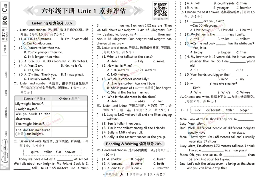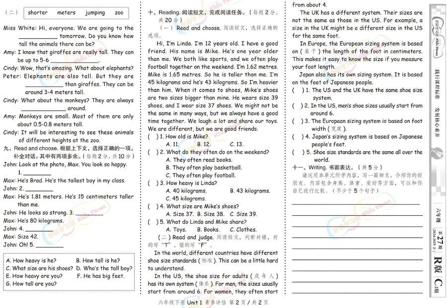 《双语学习报•Kids Times》小学英语样报 六年级 R版素养评估 第27期