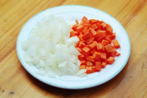 3、把洋葱、胡萝卜切成丁;
