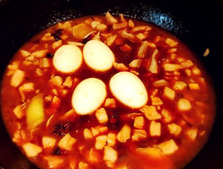 2、放入五花肉翻炒出油,胡萝卜、洋葱入锅翻炒,放2~3勺生抽,1勺老抽,放些蜂蜜,添1小碗刚才煮肉的汤,(喜欢加卤蛋的,这时候加入煮熟的鸡蛋),大火烧开,改成中火咕嘟10分钟,放3指1大捏盐;