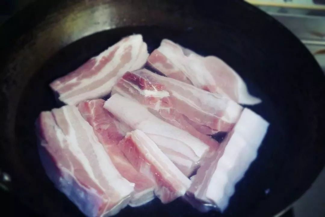 1、烧开一锅水,五花肉放进水里煮,大火烧开,小火炖煮40分钟,取出晾凉,切成小丁,把锅里煮肉的汤倒入一个盆里;