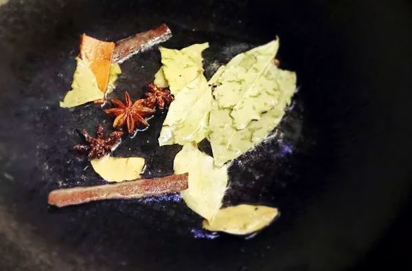 1、锅里放底油,放入八角、桂皮、香叶、干辣椒煸炒出香味;