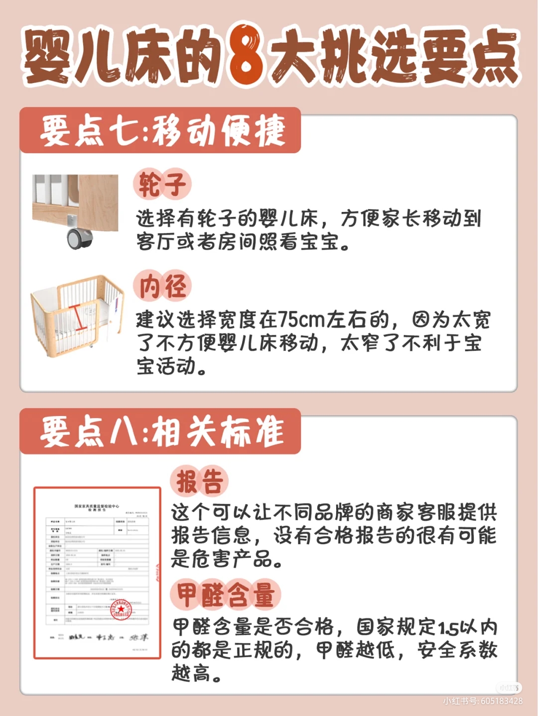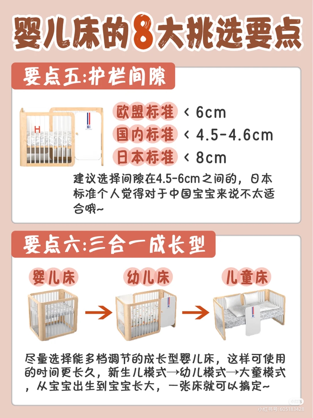 上期推介讲到了挑选婴儿床的前四个关键要点,分别是从材质、油漆、床型、护栏高度的四个方面详细进行了干货解析,本期就将另外的四大要点给大家详细奉上。