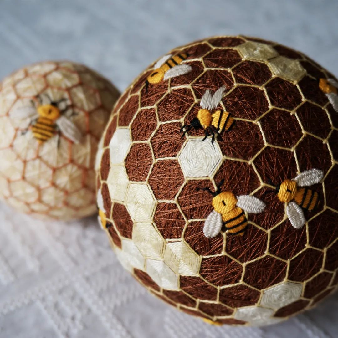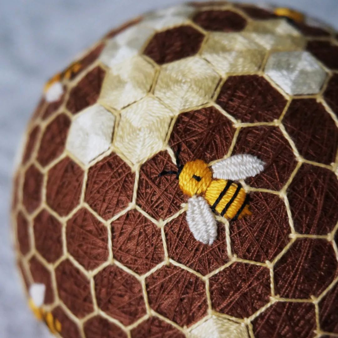 因为手鞠是球面的艺术,自然想到了用多面体手鞠去表达蜂巢与蜂忙。这枚作品采用272面体分割制作,多面体会自然保留12个五边形区域,考虑到蜂巢结构为六边形,所以将蜜蜂图案以五边形为中心进行设计制作,完成后只呈现出六角蜂巢结构。同时为了避免整体设计的刻板,还设计了不同的蜜蜂形象为点缀,以及酿蜜封盖的整体布局设计。