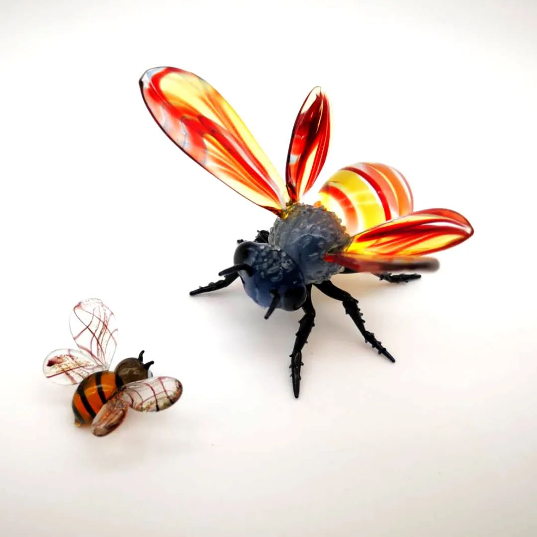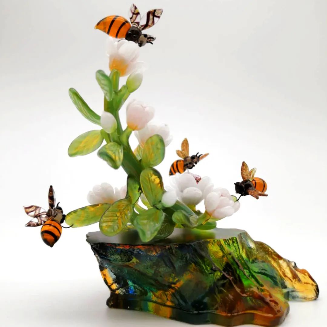 此組作品中,底座用的是脫蠟鑄造方式,小蜜蜂則是純手工燒製,總計作品中用了三種玻璃材料(琉璃料,鈣鈉玻璃,高硼硅玻璃,分別取其不同料性表現各不同部位~小蜜蜂靈活小巧用的是較低溫的鈣鈉玻璃,大蜜蜂用的是較高溫的高硼硅玻璃燒製,底座需要重量&穩固,所以用的是鑄造的含鉛琉璃料)