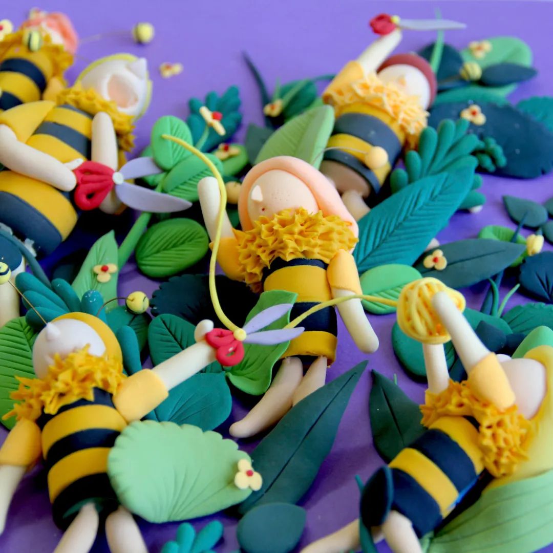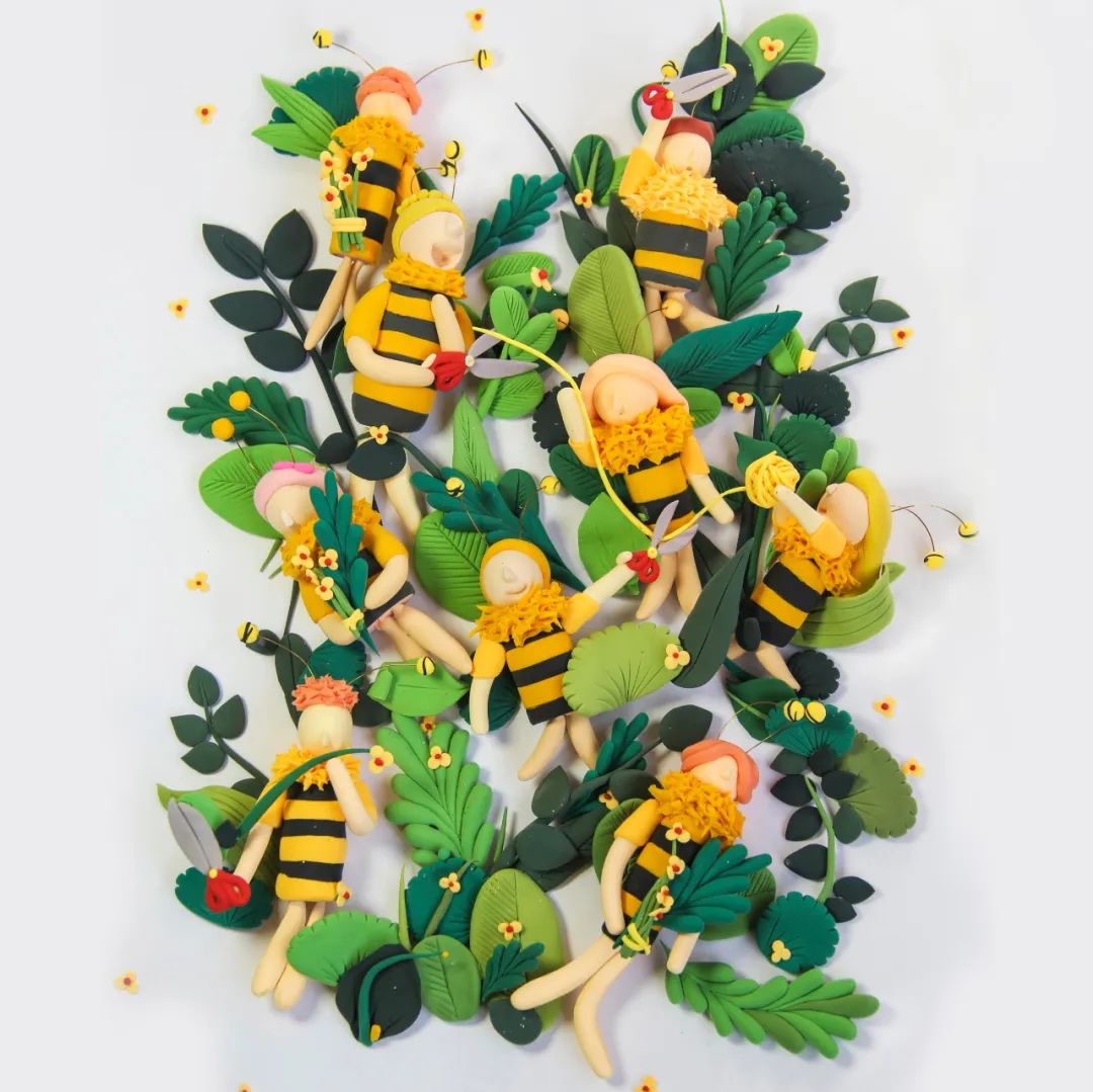 前期我制作了10只蜜蜂精灵,通过选色、身材塑造与不同材料的结合比例区分其性格和工作内容,以此构建一个相对完整的蜜蜂家族。