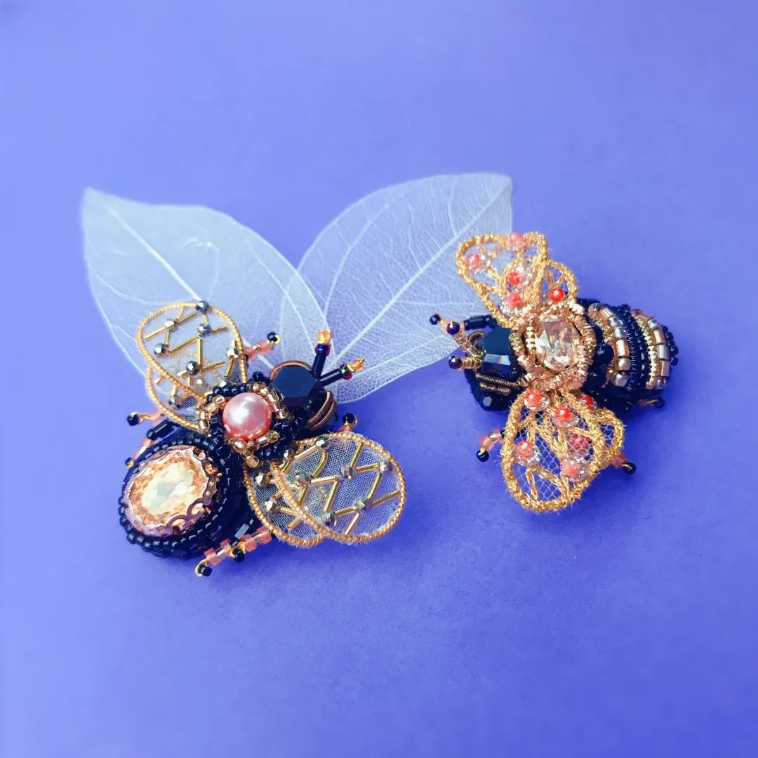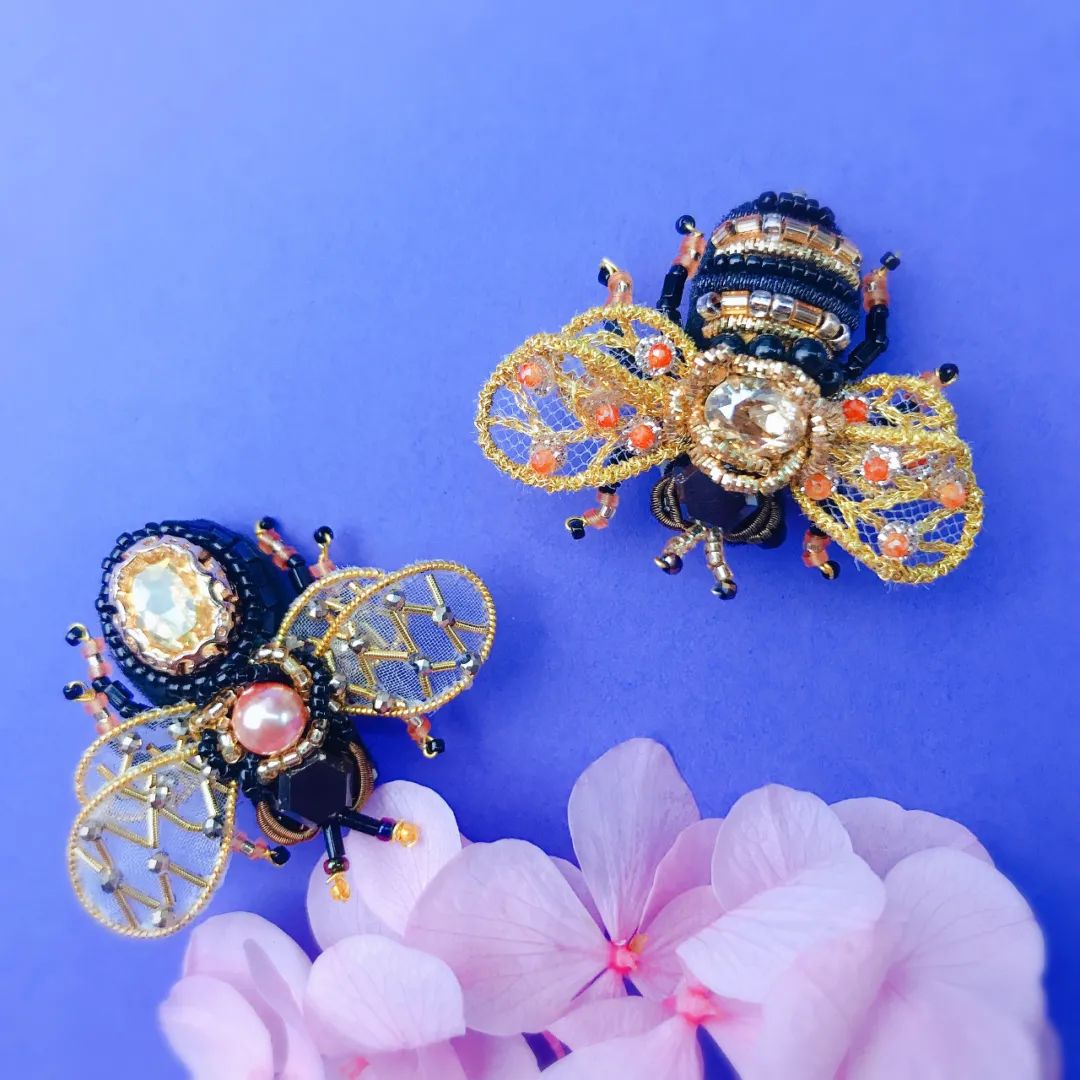 这两只小蜜蜂各自采用了10多种不同规格的材料和法绣技法制作而成,技法的不同就展示出了不同的成品效果。在成品的佩戴方式上我最后选择了安全别针,这样可以作为胸针,丝巾扣,帽饰、包饰等多种搭配方式进行佩戴。