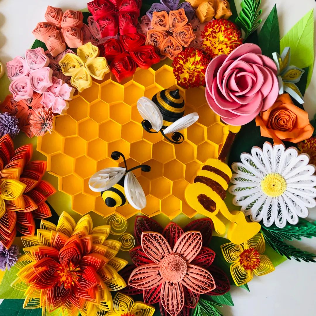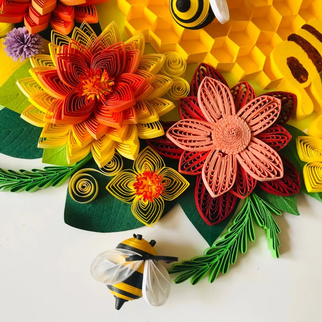 衍纸是一门延展性和可塑性非常高的纸艺,先是手绘线稿,然后进行纸雕,随后应用各种衍纸素材的花朵装饰,最后加入活灵活现的小蜜蜂。