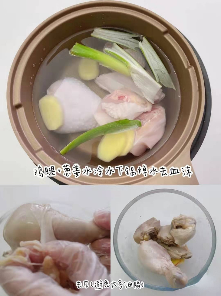 ②把鸡腿加葱姜冷水下锅,煮开去血沫。把鸡腿皮去掉,避免太多油脂影响口感。