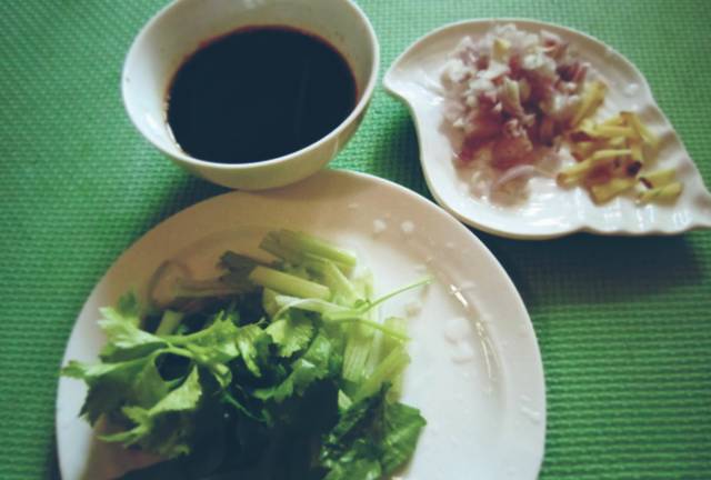2、把洋葱剁碎,姜切丝,香芹切段;