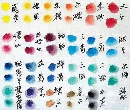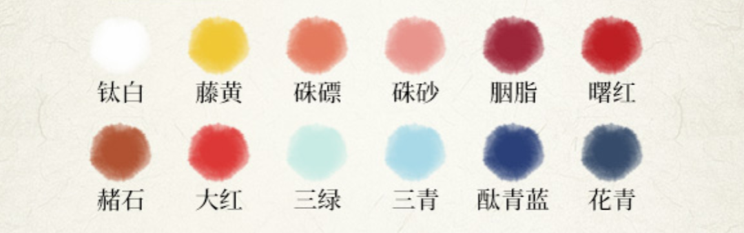胭脂、朱砂、朱磦、曙红、花青、三绿、三青、藤黄、酞青蓝、钛白、墨黑、赭石。