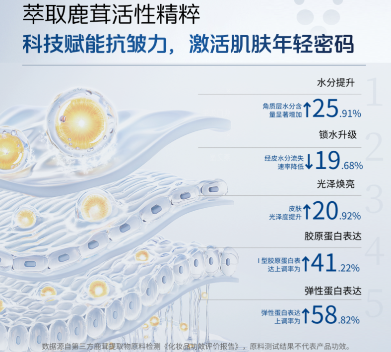 数据源自第三方鹿茸提取物原料检测《化妆品功效评价报告》,原料测试结果不代表产品功效。