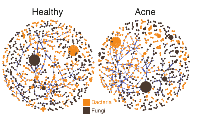 菌群一般因人/因肤/因年龄而异。用2018年在Microbiome期刊上就发布的一幅图为例:健康肌肤和痘肌的『菌群差异』*。