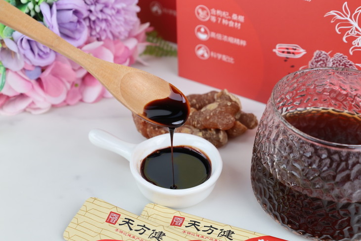 可以选择易于坚持的膏方——天方健新品「黄精固黑膏」,膏方原料包含了枸杞子、桑椹、黄精、芡实、覆盆子、牡蛎、黑芝麻。一共7种中药材,精心搭配,历经32小时匠心熬煮,低温高效浓缩而成。