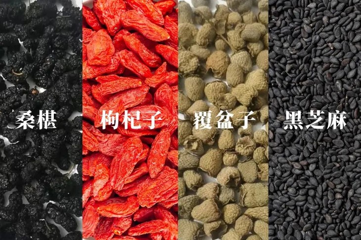 以上四味药食同源中药材,合用益肾阴养肝血,可改善肝肾阴虚导致的腰膝酸痛、须发早白、眩晕耳鸣、肠燥便秘等不适表现。