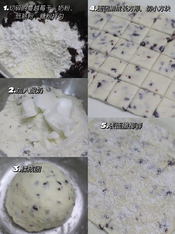 1、将蔓越莓切碎,加入奶粉、低筋粉、糖粉拌匀。再加入酸奶揉成团