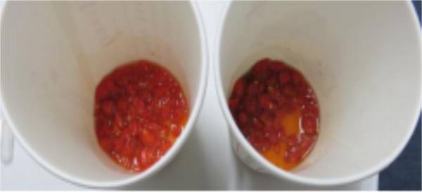 掐碎汁家枸杞的人,手指无明显染色;而另一份,手指上留下橙红的染色。