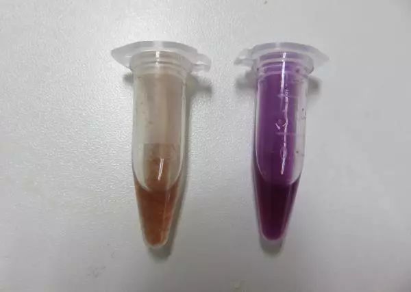 3、分别放入两个杯子,各加入等量纯净水,搅拌,然后取样放入测硫溶剂试管,反应结果是这样滴: