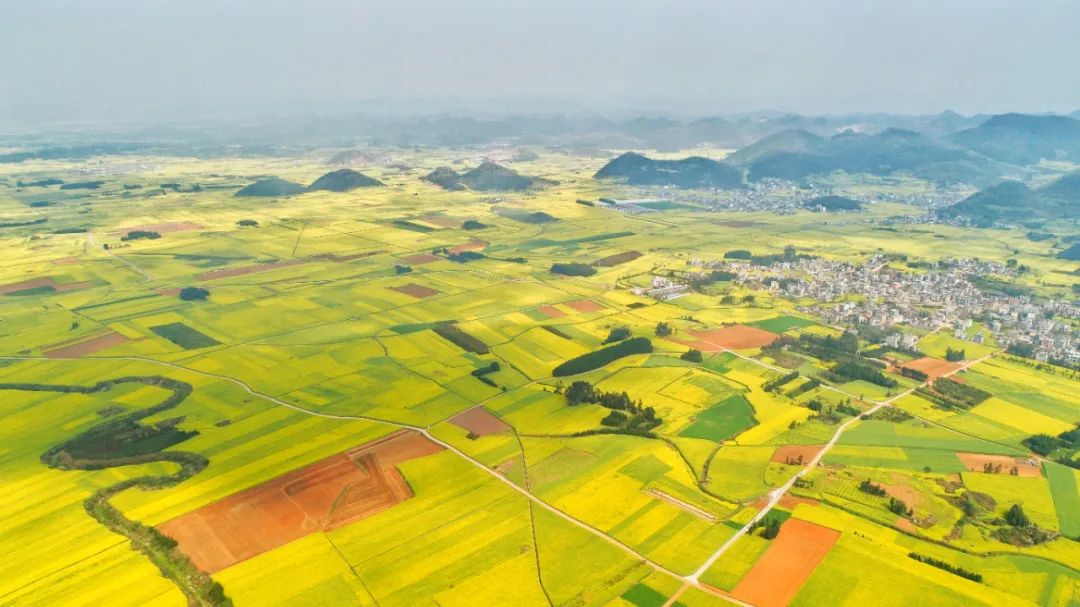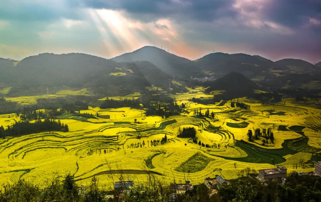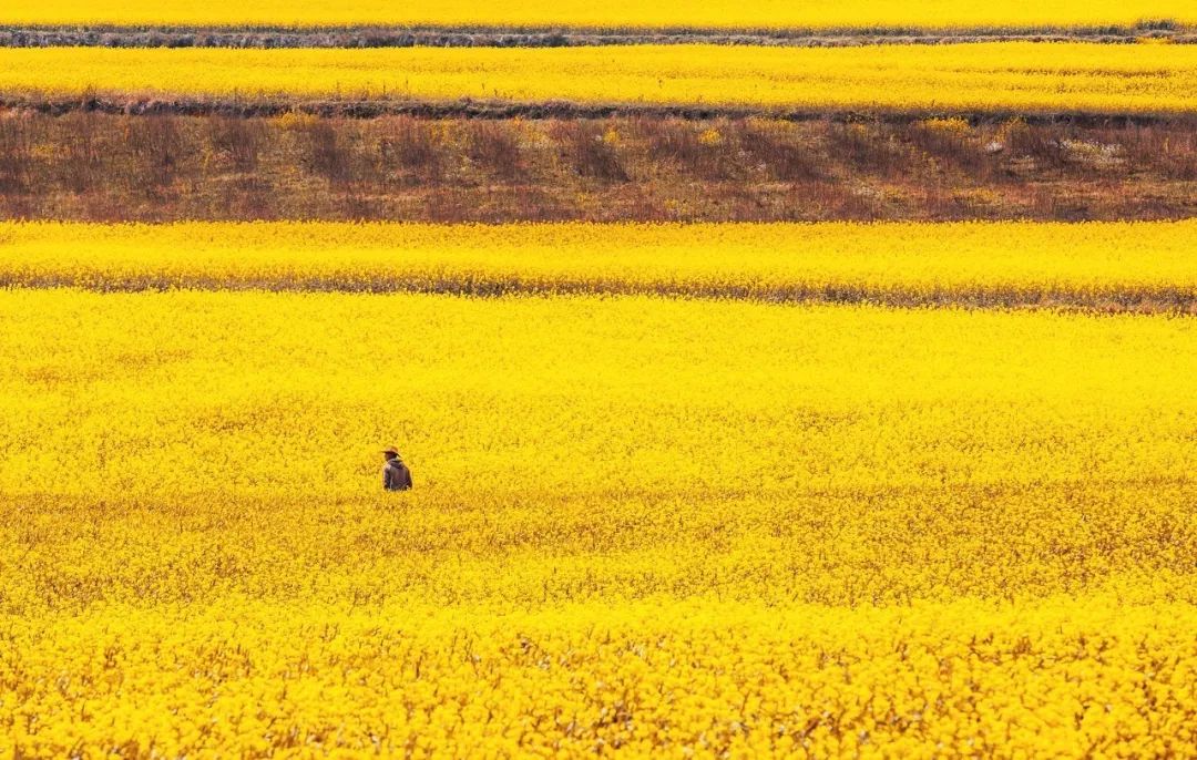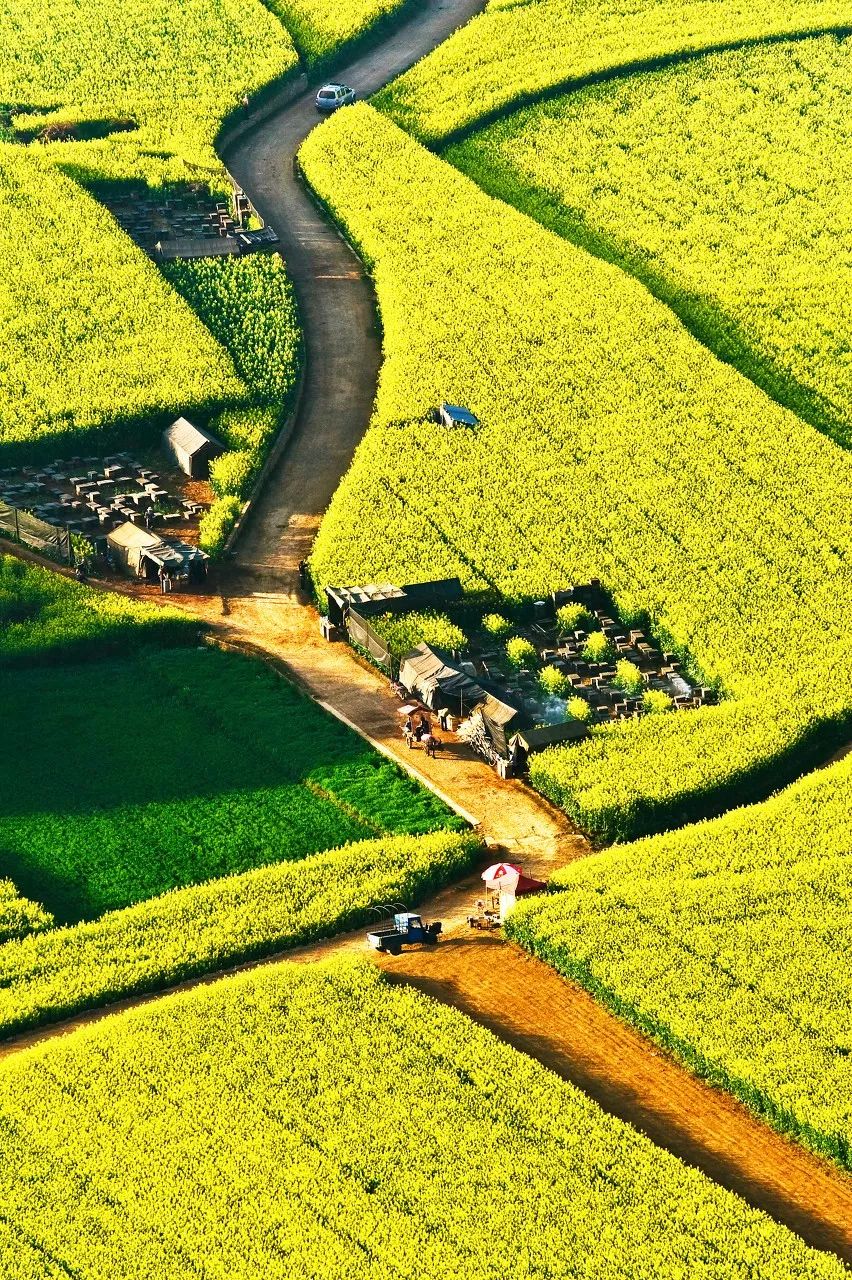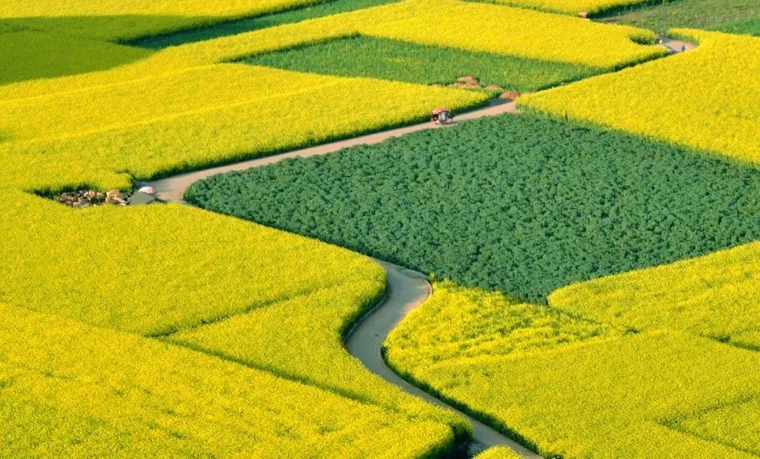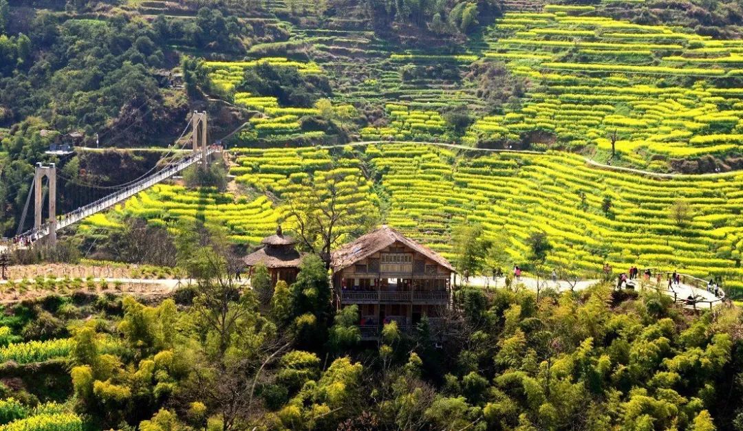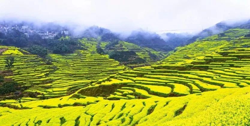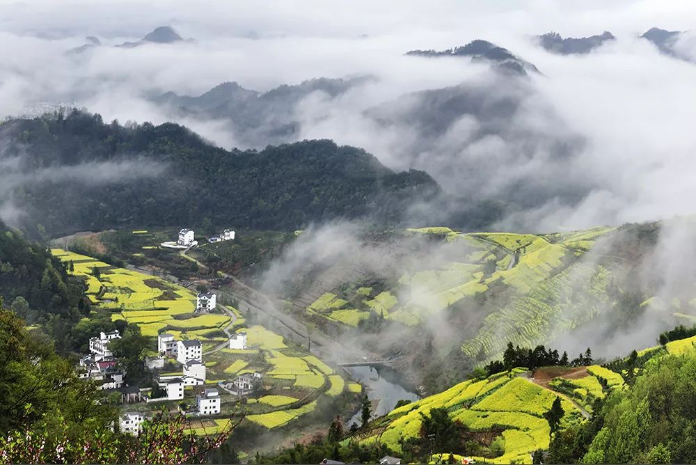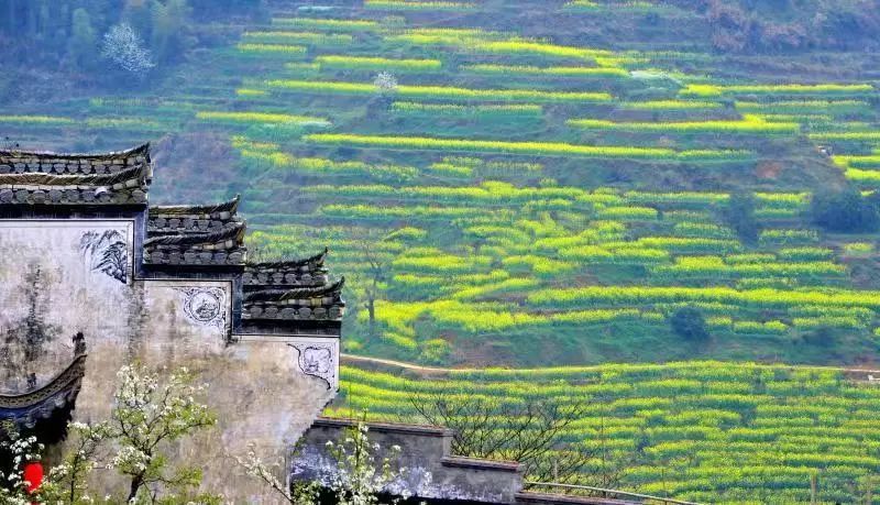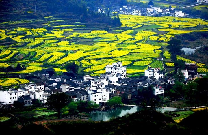 白墙黛瓦的徽派民居散落在一片金黄之间