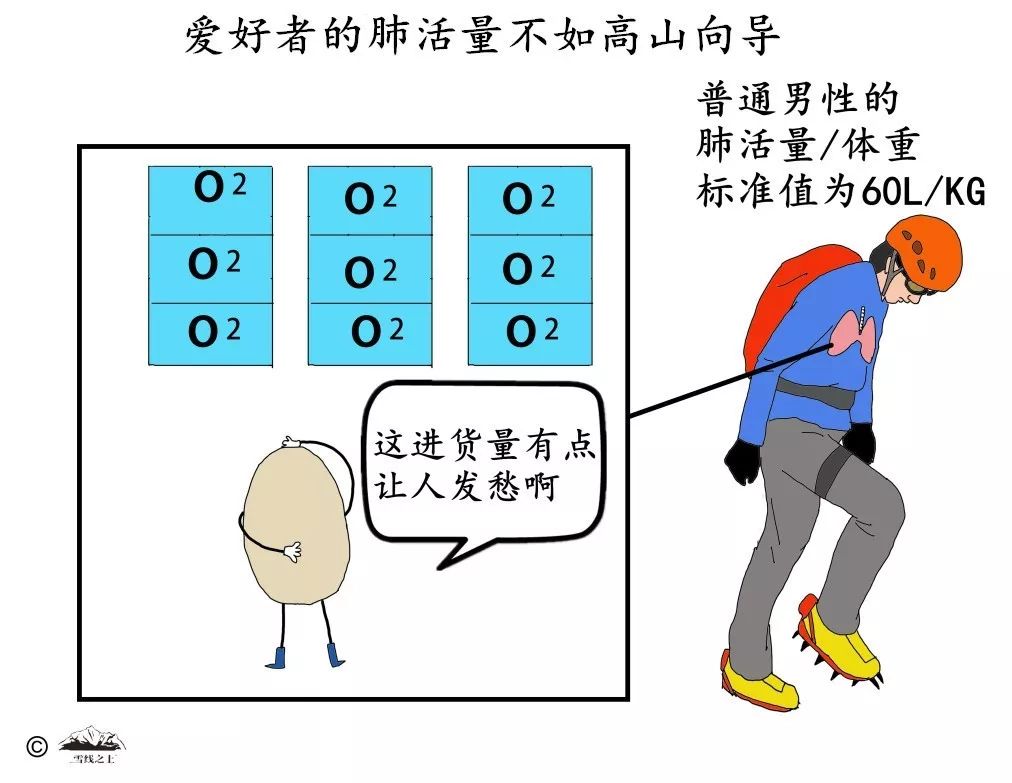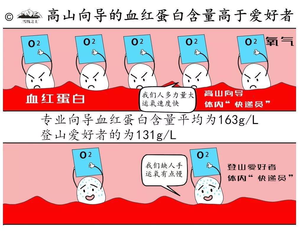 我们可以把高山向导与爱好者的身体比作快递公司,肺活量就像是仓库的货量,血红蛋白含量就像是快递员。