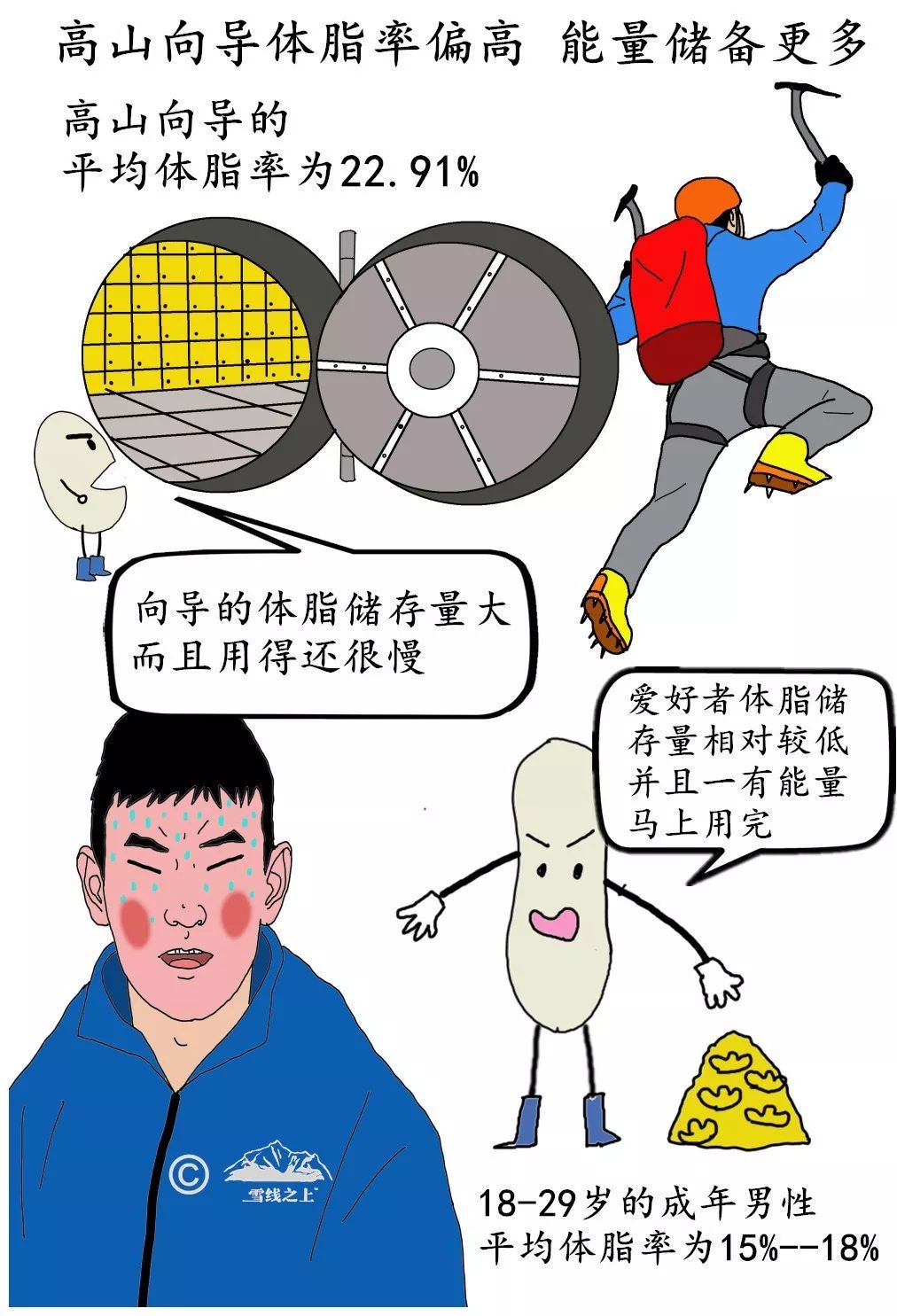 所谓存款更多,指的是身体脂肪含量更高,较高的体脂率使向导拥有强大的能量储备,能够在低温高海拔地区完成更久的攀登。
