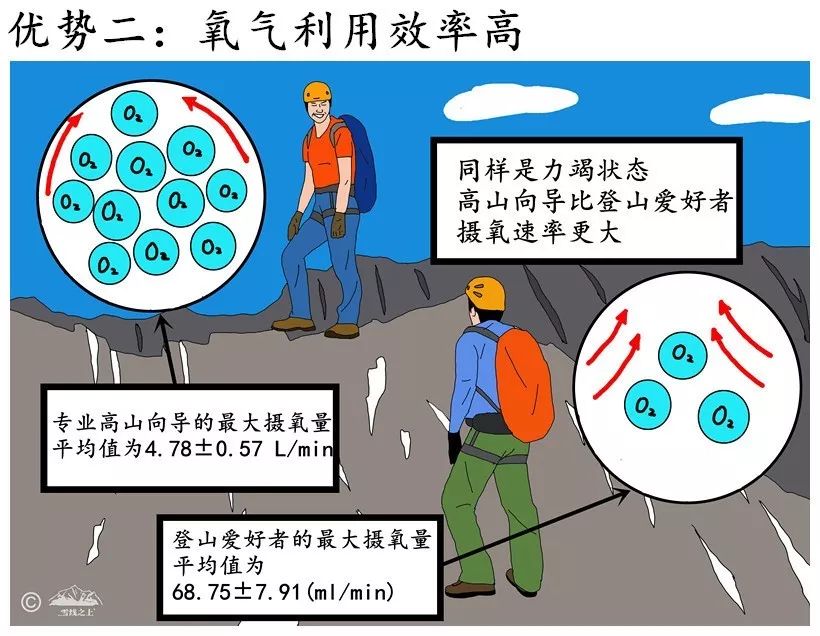 最大摄氧量是指身体运动强度达到极限时的摄氧速率,专业高山向导的最大摄氧量更大,能摄入氧气的极限更高。