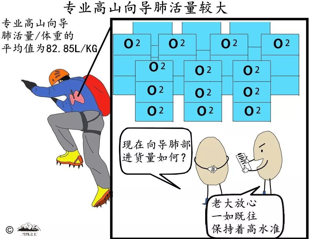 与普通爱好者相比,高山向导的肺活量更大,每次能吸入更多氧气,同时高山向导体内血红蛋白的含量高,携氧量大,运输氧气也就更快。