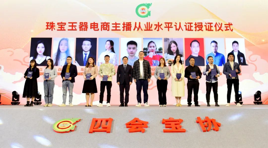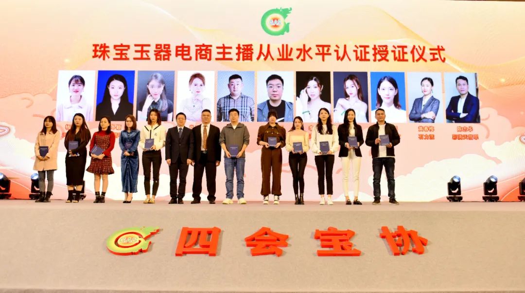 随着电商(直播)行业的快速发展,对直播从业人员的要求也越来越高。协会与国检教育联合编制《珠宝玉石直播职业信用评价规范》团体标准并在2021翡翠产业年会上进行了四会首批主播从业水平认证颁证仪式。借协会年会的契机,对第二批优秀珠宝玉器电商主播从业水平认证进行授证。国检教育徐军校长、四会宝协秘书长罗荣俭、四会宝协电商委员会副主任于航崇为珠宝电商主播授证。