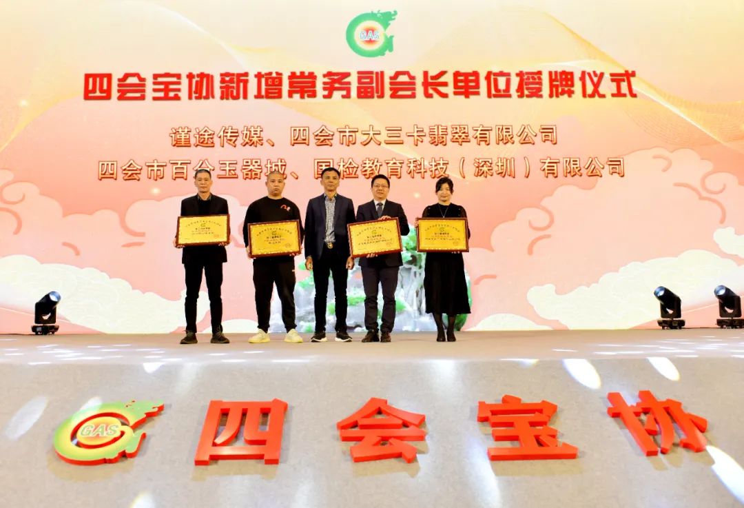 ▲四会宝协荣誉会长潘伙森为新增常务副会长单位进行授牌。(谨途传媒、四会市大三卡翡翠有限公司、四会百分玉器城、国检教育科技(深圳)有限公司)