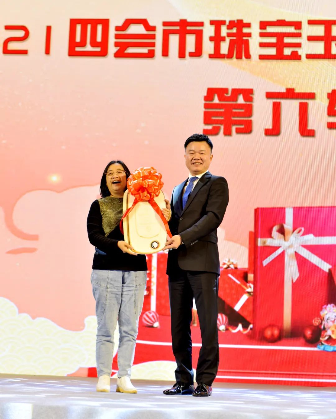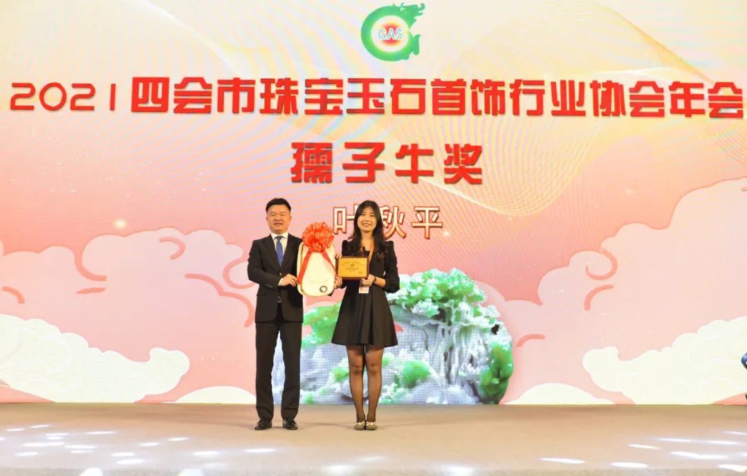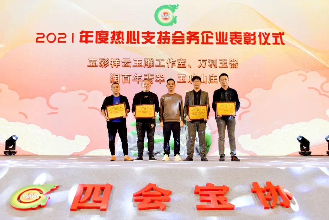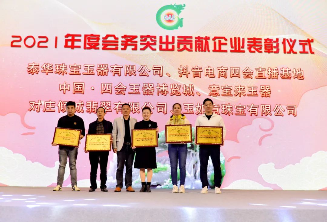 ▲四会宝协荣誉会长严文乐为2021年度会务突出贡献企业表彰。(四会市泰华珠宝玉器有限公司、抖音电商四会直播基地、中国四会玉器博览城、意宝来玉器、四会市对庄倾城翡翠有限公司、四会市玉如意珠宝有限公司)
