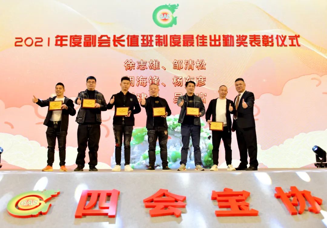 ▲副会长值班制进一步加强,值班副会长积极参与协会会务工作,为协会、四会玉器产业发展贡献力量。四会宝协秘书长罗荣俭为谢建强、杨东彦、吴春富、邹清松、徐志雄、胡海锋颁发最佳出勤奖。