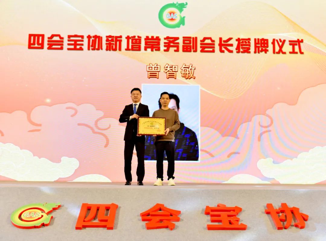 ▲四会宝协会长胡立华为新增常务副会长曾智敏授牌。
