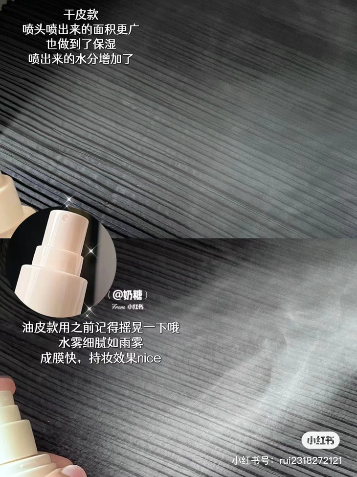 偏干肤质的姐妹,相比较散粉,定妆喷雾会更温和;不仅不会卡粉,还能保持肌肤原本的光泽感。