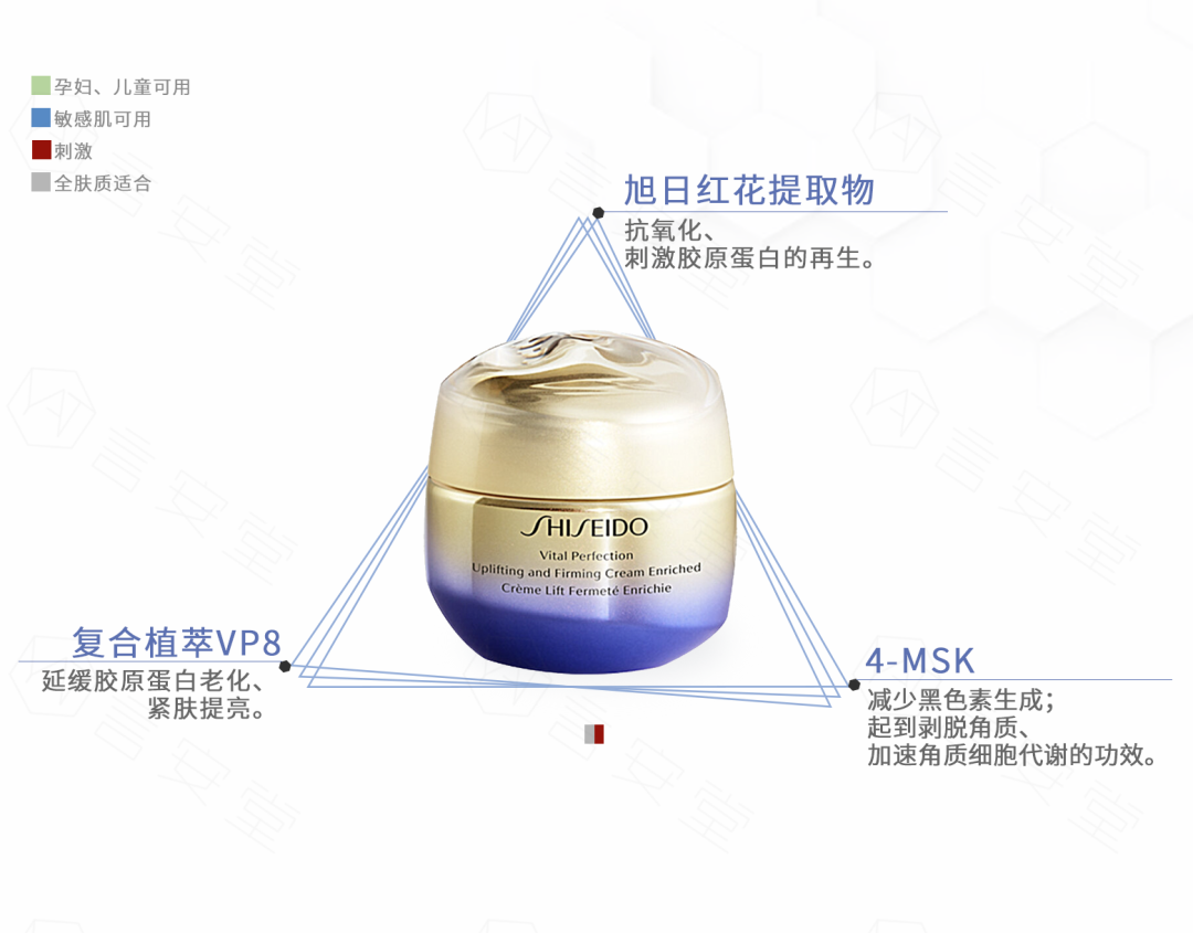 主要起到抗氧化、刺激胶原蛋白的再生的作用。类似功效的抗老活性物还挺多的,这里算是资生堂品牌里一个比较独特的故事。