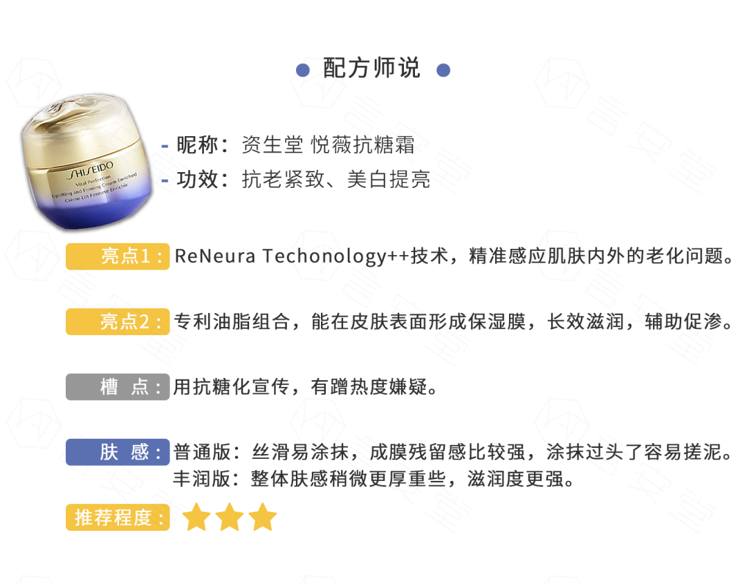 很多关于这瓶面霜的宣传在强调它的抗糖化功效,其实人家在英文官网上并没有这么说啊,也没有特别的原料来直接与抗糖化功效相关联,可能是知道中国消费者对抗糖化这个概念比较认同(用了抗糖化面霜平时就可以更安心地喝奶茶了…),有故意蹭热度嫌疑。