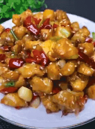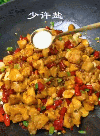 倒入鸡丁翻炒均匀,然后加入白糖(少许)、盐(少许)翻炒2分钟左右。撒上熟芝麻,翻炒均匀即可出菜。