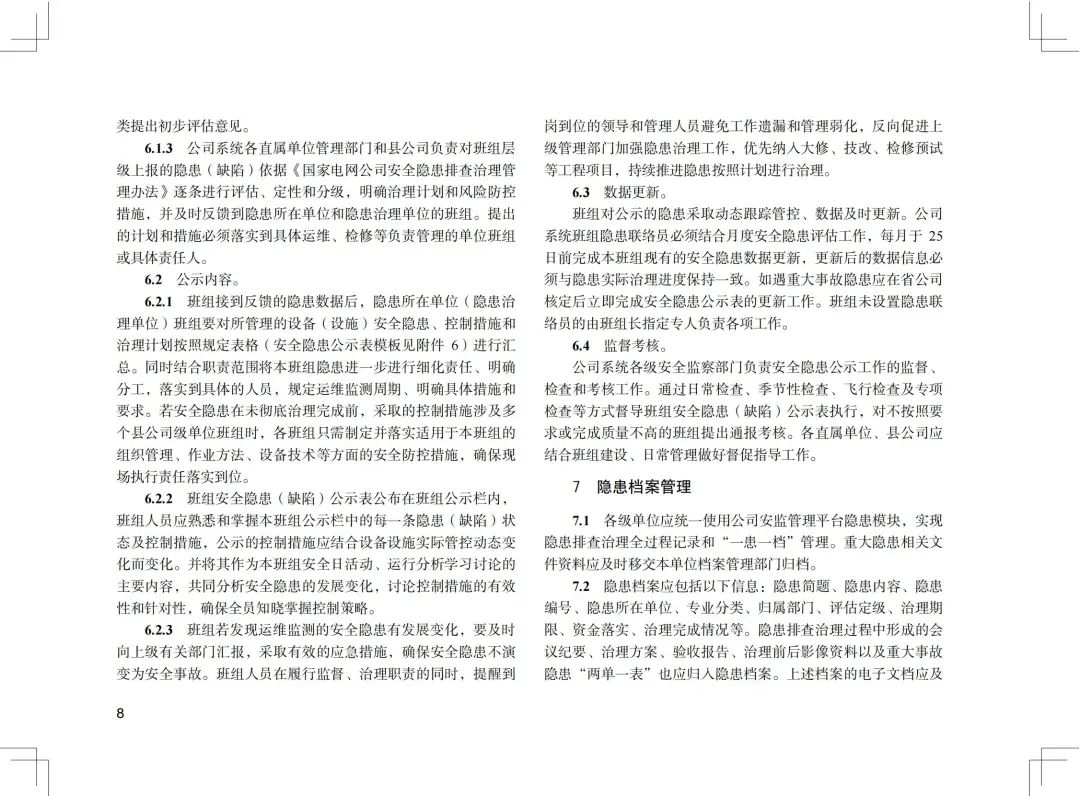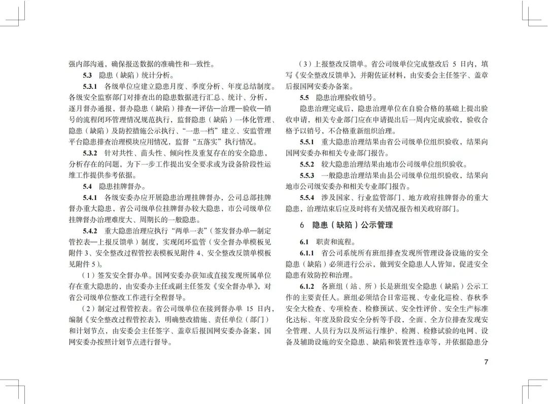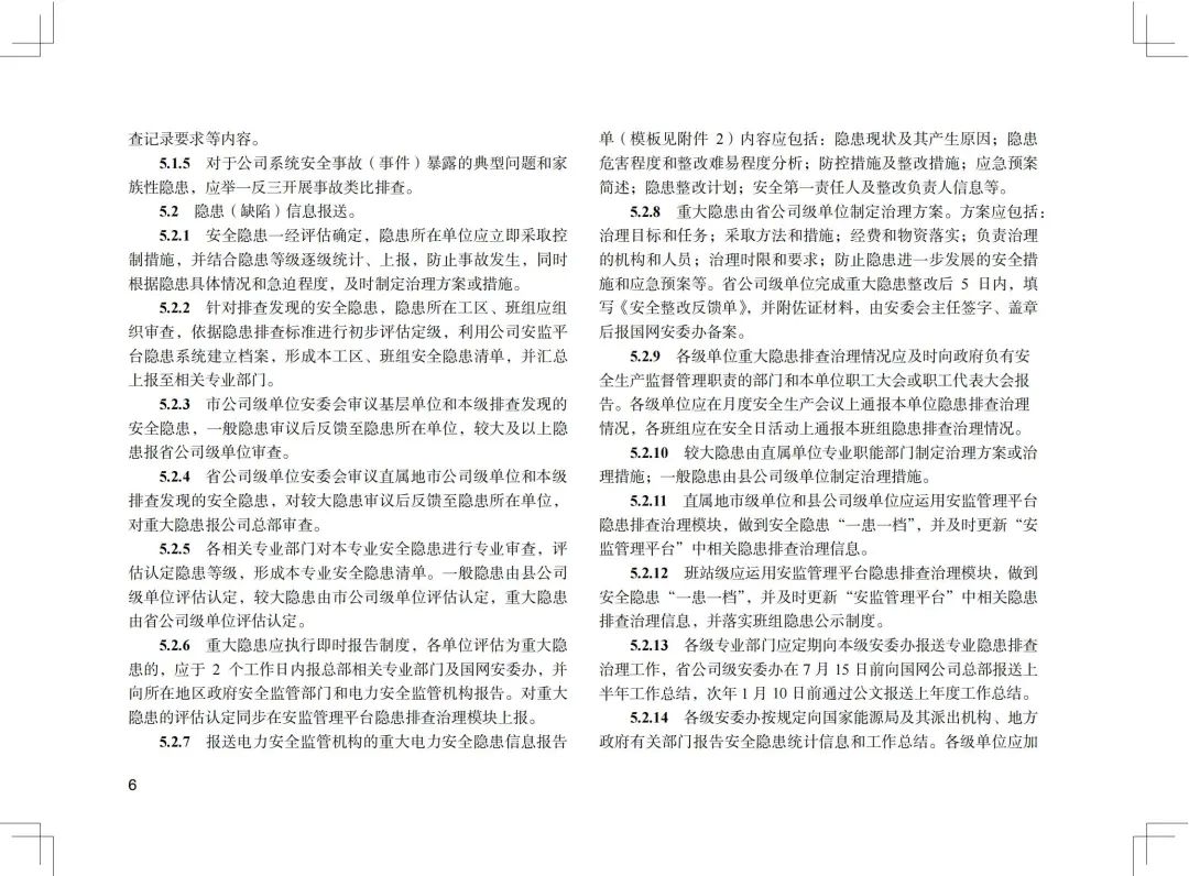 为进一步指导基层单位更好开展隐患排查治理工作,作者根据国家电网有限公司安全隐患排查治理管理办法(2022)5号文件要求,同时收集各基层单位隐患排查治理工作成果的基础上,编制了《国网陕西省电力公司隐患(缺陷)排查治理规范使用手册(第二版)》,手册从隐患管理组织机构职责、排查方式及范围、信息报送、统计分析、动态跟踪及闭环销号、档案管理、督办奖励等方面提出了新要求。特别对隐患排查档案表的填写进行了规范统一,对发现、预评估、评估、治理、验收整个闭环过程,从时间节点、隐患描述、评判及后果定性依据、防控措施、治理完成情况及闭环逻辑关系进行考核量化。