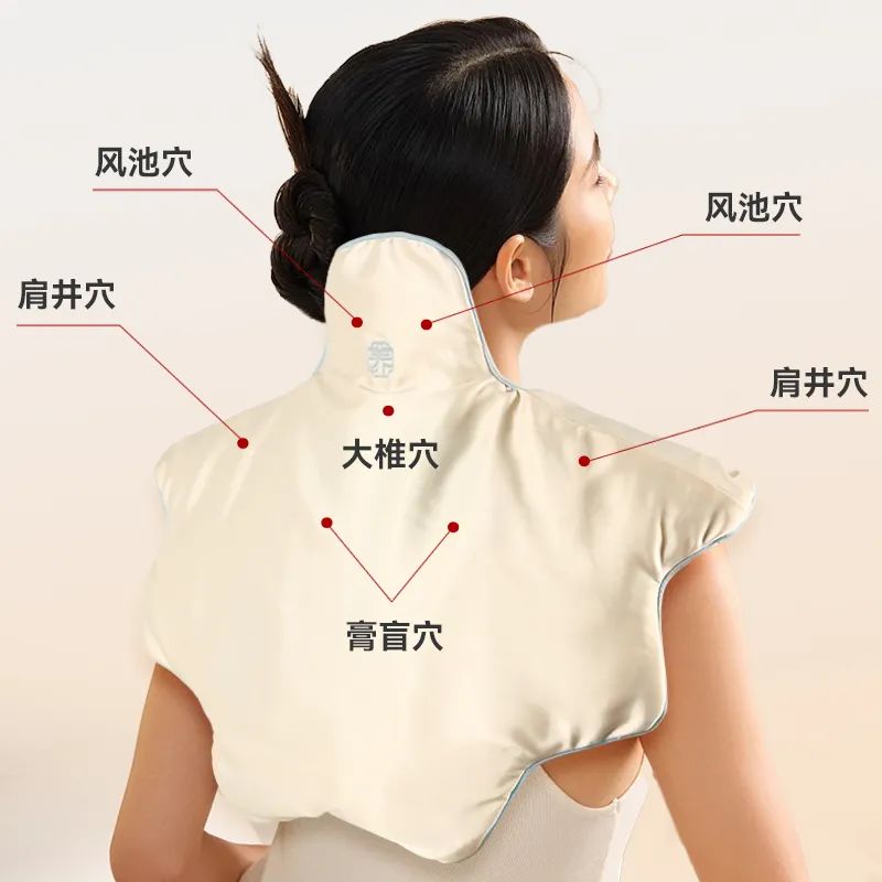 热敷小云肩前后都能覆盖,发热面积涵盖肩颈背部5条重要经脉,督脉、膀胱经、胆经,上至风池穴,下至膏肓穴,中连大椎穴、肩井穴,温灸每一寸肩颈。