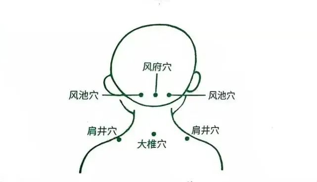 2. 项三带:首先从后脑勺发际正中线开始,经大椎穴刮至第三胸椎棘突下(身柱穴),两侧从风池穴经肩上(肩井穴)刮至肩髃穴。