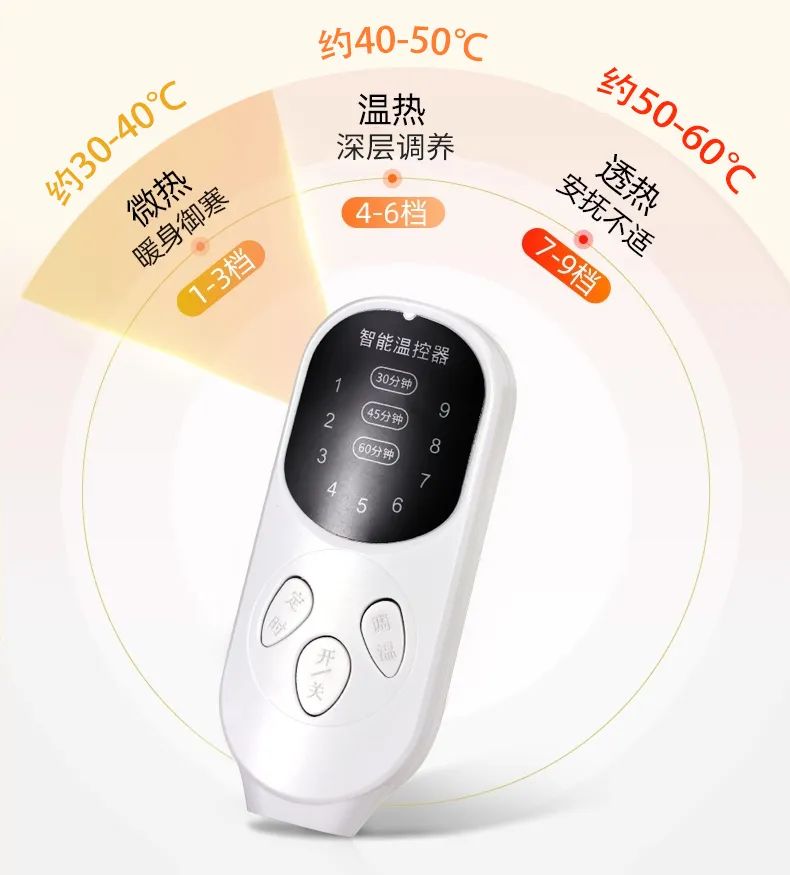 9档调温、3档定时的智能调温加热芯,可根据自身需求调节温度及时间,热敷体感更舒服,简易操作,老人也能轻松使用。