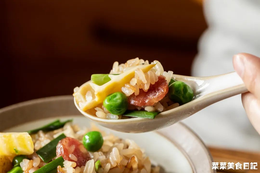 (后来不甘心跑去荣小馆吃了份黑松露咸饭)其实饭里的食材都挺家常的,刚好春笋到手,撸起袖子复刻之!没有新荣记的冬糯米也不怕,用五常大米就很好吃,照样软糯,还不容易腻味。春笋要舍得切掉硬实的根部,后续吃口感不至于打折扣(幸好春笋够壮实)。腊肠用了我偏爱的广式腊肠,来一个岭南、江南对对碰,你们用家里现有的也行。蔬菜、肉类先行煸炒,再下入煮到半生熟的米饭一块儿焖煮。这样肉、菜、饭同时熟成,配菜既有一点焦香,也不至于焖久了颜色不好看。嫌麻烦的,也可以电饭煲煮好米饭,再和煸炒过的食材一起翻拌均匀。都说春笋刮油,用油脂和碳水中和一下,就不至于伤胃,成功说服自己多吃两碗~ 春笋3根 小土豆100g 甜豌豆50g 韭菜30g 咸肉150g 腊肠1根 五常大米/圆糯米200g 盐1小勺 糖1小勺 生抽1-2大勺 黄酒/料酒1大勺1大勺=1 table spoon=15ml