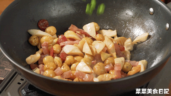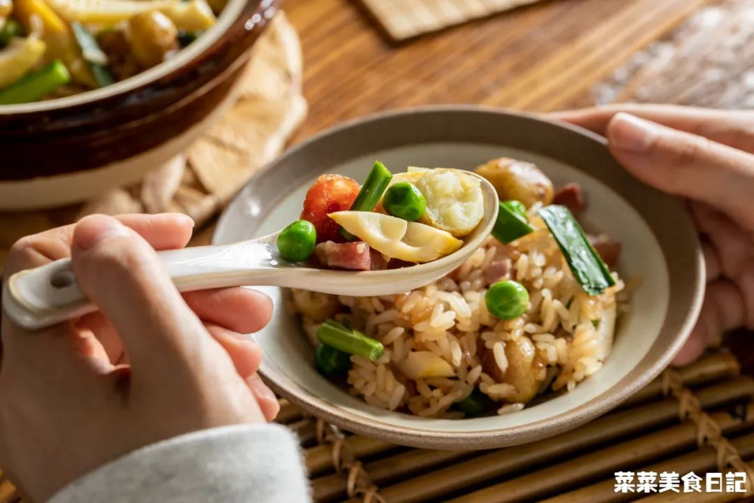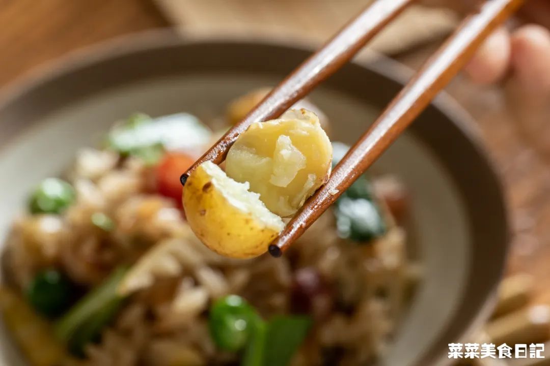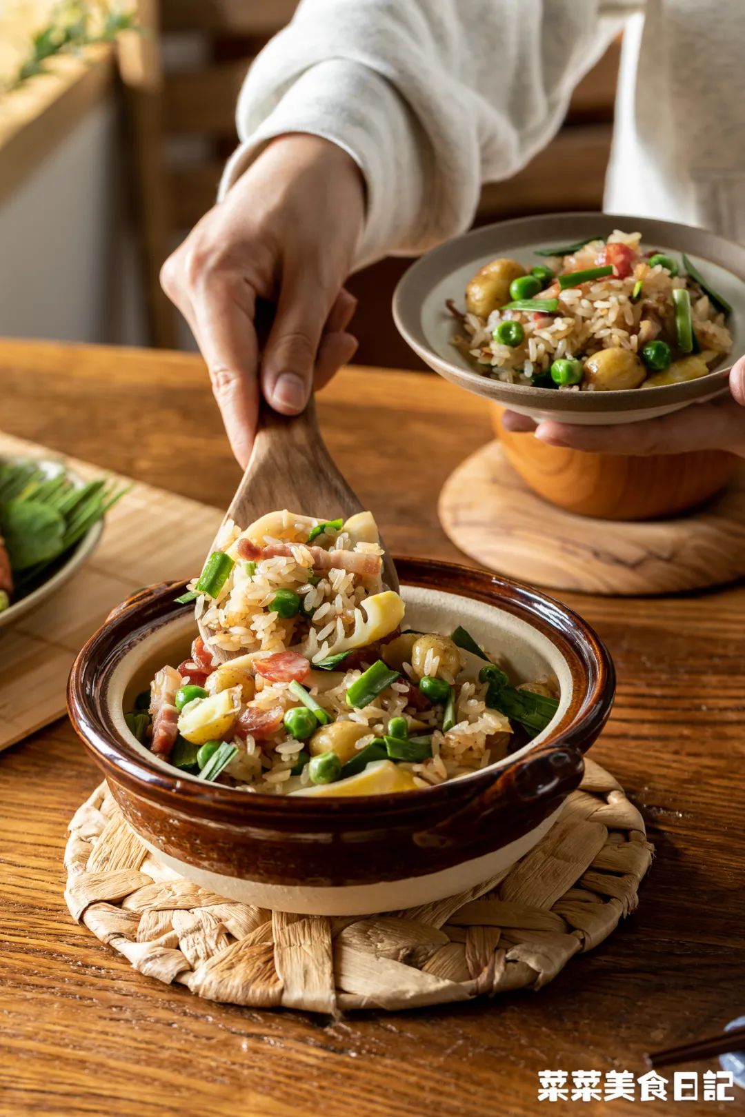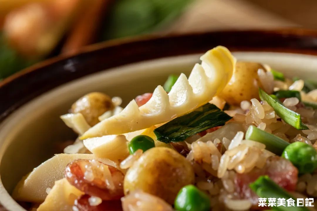 1小勺=1 tea spoon=5ml1.咸肉提前浸泡半小时或沸水煮5分钟,去除多余咸味后切丁,腊肠切片3.煮一锅沸水,放入大米煮5分钟,煮至5-6分熟,捞起沥干,米汤留用台州咸饭一般用糯米,或糯米混合粘米各一半,看个人口味4.起锅热油,小火煸香咸肉、腊肠,炒出油脂,加入土豆、春笋、1大勺黄酒、1小勺盐、1小勺糖翻炒至土豆微微上色,撒少许米汤,盖盖焖10分钟,焖至土豆断生5.倒入沥干的米粒、2大勺生抽翻炒均匀,锅边加入2大勺米汤,盖盖小火焖10-15分钟烹煮五常大米水份比例是1:1.2,比普通米的少,其他粘米或糯米可多加1-2勺米汤6.焖至米饭断生,水份收干后,关火撒上韭菜,翻炒均匀即可开吃米饭颗颗分明,和油脂抱了个满怀,泛出晶莹油亮的荣光。入口油而不腻,软中带着嚼劲,又有粘糯感,越嚼香气越盛。若是吃到春笋尖尖,幸福感更具象了,简直比舌头还嫩!小土豆带着皮,又粉又糯,豌豆一压就爆浆,甜感骤然溢出。开吃前快速搅拌,利用余温来加热,半命韭菜最是香嫩。食材虽多,融合度却很高,冬春在碗里涌动,回味幽远~来赴一年一度的春笋之约了!今年依旧优选临安天目山的春笋。外皮划开、剥落,指甲轻按便陷落一弯月牙,和想象中一样细腻。剥完就切块丢进清水里,吃口脆、嫩、甜、鲜,不愧是等了一年的临安春笋!农户新鲜采挖后,还要手工筛选,确保春笋个头均匀饱满。仔细挑选完,冰袋+保鲜袋+泡沫箱+顺丰发货,只为了能让大家第一时间尝到鲜味。时鲜不等人,喜欢的朋友赶紧下单,错过了只能下一年再会咯!戳下图即可购买