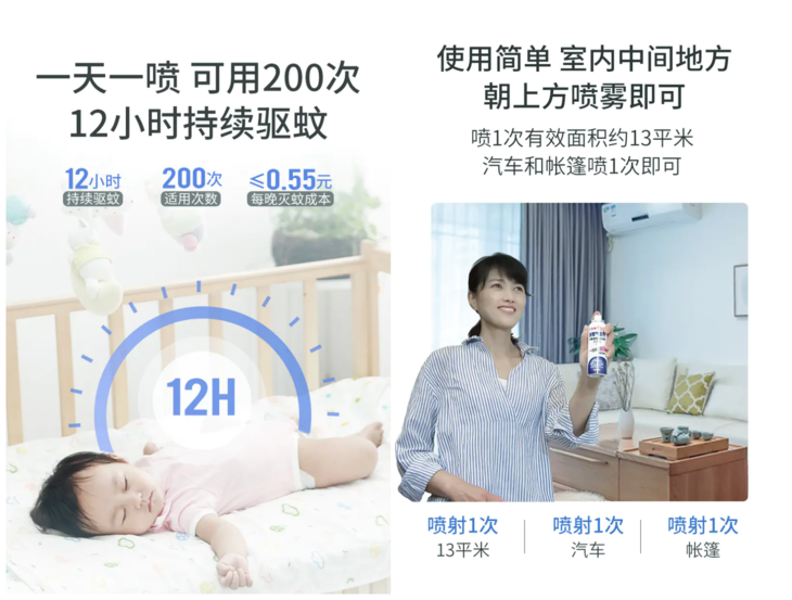 喷雾可用200次(体贴设置的定量科技),有效期12小时,户外帐篷内一夜喷一次就能整夜灭蚊!睡醒精神饱满!