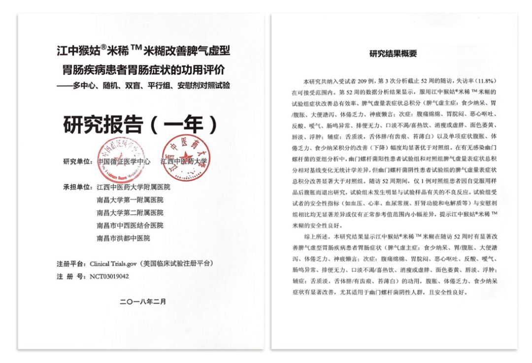 ➢ 研究证明:江中猴姑米稀有显著改善胃肠疾病患者胃肠症状,包括胃/腹胀、恶心呕吐、胃院痛、反酸、嗳气、体倦乏力、排便无力、肠鸣异常、浮肿、消瘦或虚胖、面色萎黄和大便溏泻等功效。