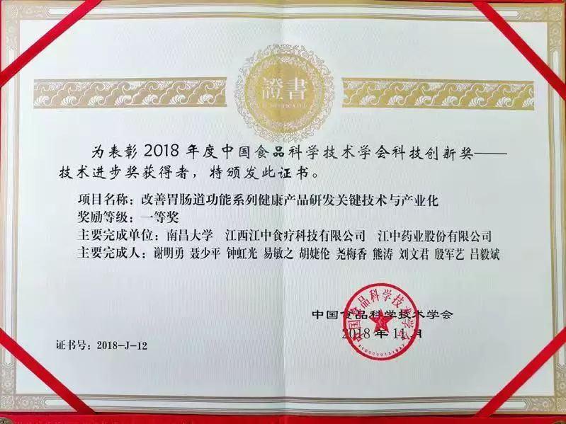 中国食品科学技术学会第十五届年会上,江中食疗凭借“改善胃肠道功能系列健康产品研发关键技术与产业化”这一创新科技研究,荣获“中国食品科学技术学会科技创新奖——技术进步奖一等奖”。