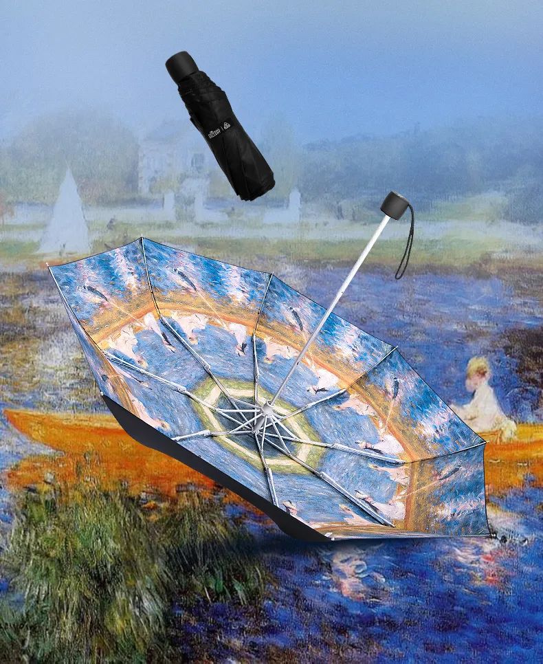 伞套上也是名画图案,特殊的扁平五折伞设计、透明UV涂层,自重只有165克,可以轻松将伞折叠成手机大小,随身携带很方便。聚酯手柄质感圆润细腻,握感十分舒适。