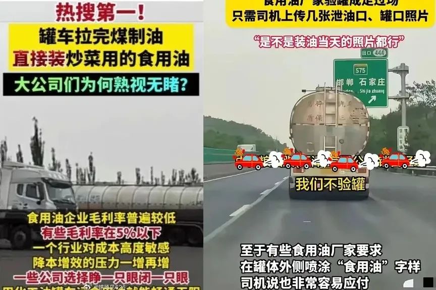 前段事件,媒体曝光油罐车化工油食用油混装,一些油罐车既承接糖浆、大豆油等可食用液体,也运送煤制油等化工类液体,引发舆论哗然!