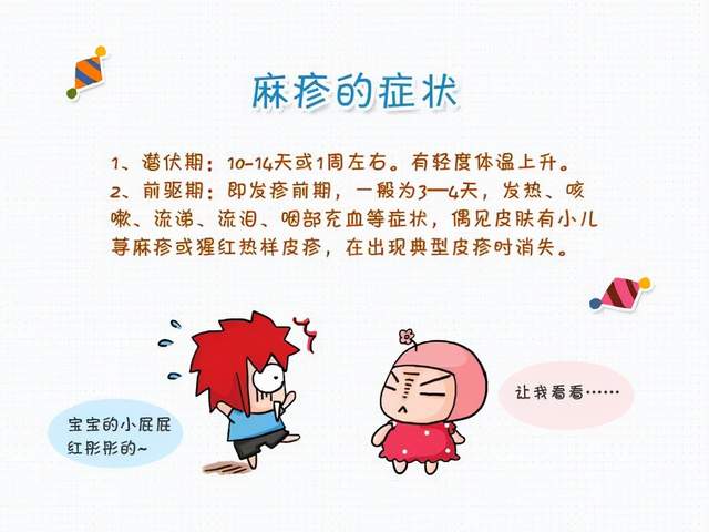 麻疹后期:出疹子后的2到4天,宝宝体温开始下降,疹子随之消退。但会留下淡淡褐色的印记同时还可能伴随脱皮,这个症状大约会在一周后消退。