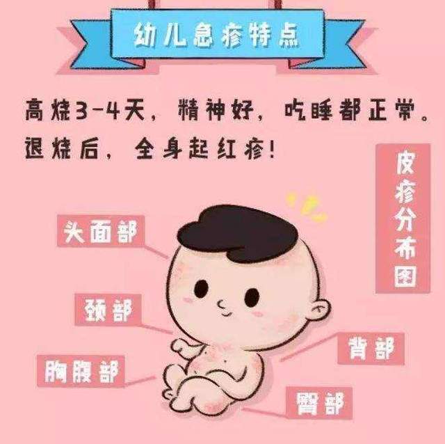 宝宝体温恢复正常后皮肤上会出现细小的、粉红色的斑点状皮疹,用手按压会褪色,主要出现在宝宝的头部、腰部、臀部,会持续3-4天左右,消褪后不会有印记;